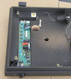 Enlarge hole for motor in baseboard to approx 40mm diameter to allow the motor to be fitted – the motor is best not attached to the top board if you want minimal noise through the speakers. I found drilling the hole easiest by drilling a 3mm hole through from the top and then going through with a 1.5″ fluted cutter from the underside with plinth turned upside down.