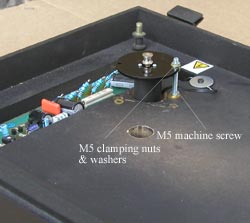 Using 2 M5 nuts and 2 M5 washers clamp the motor plate at the correct height – i.e. the top of the motor plate is level with the top of the plinth. If you tighten this to a reasonable tension you can swivel the motor to give the correct tension and it will hold in place by friction.