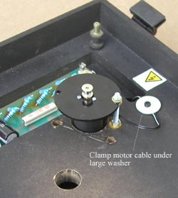 Motor power wires are clamped in position using large washer and screw. This prevents straining the soldered joints on motor.